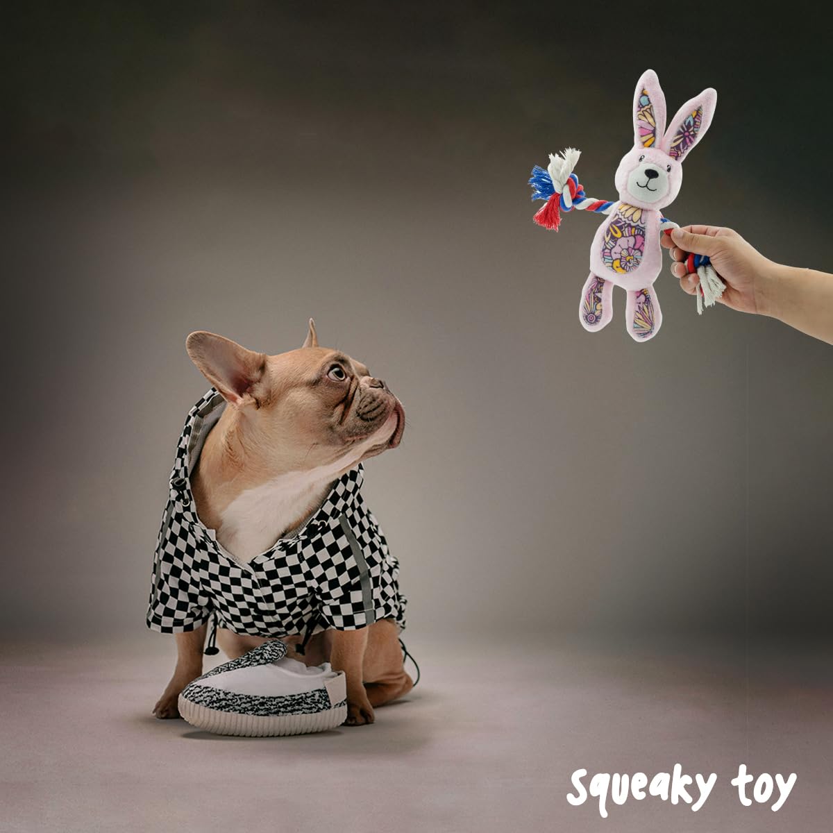 • Floral prints on R-PET fabric add visual appeal and eco-friendly touch. Includes a squeaker inside for interactive play and auditory stimulation.